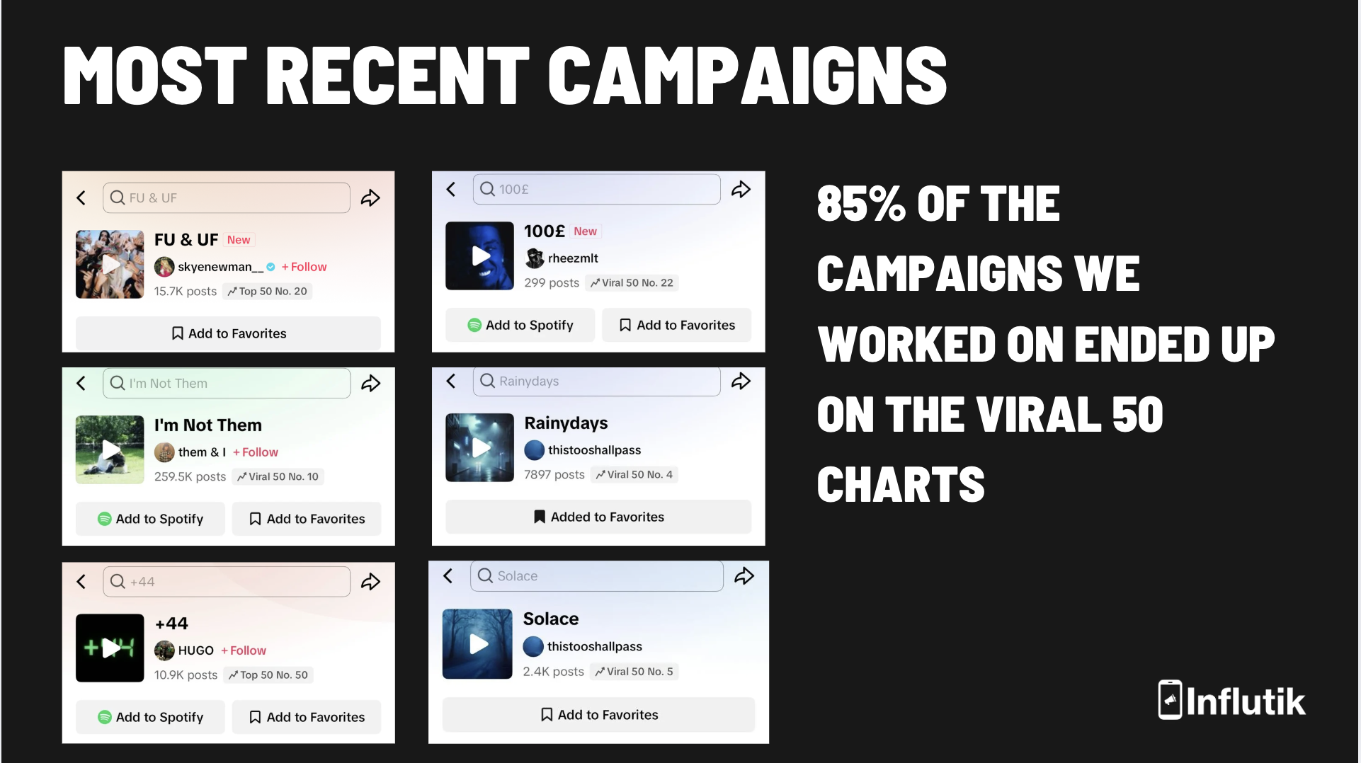 We run viral music campaigns by leveraging our owned & operated creators and technology. We have a track record of charting 85% of our songs across the TikTok Viral 50 Charts.